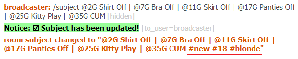 Example Subject + Target Goals (at 100 tokens per-goal): /setsubject @2G Shirt Off | @7G Bra Off | @11G Skirt Off | @17G Panties Off | @25G Kitty Play | @35G CUM
