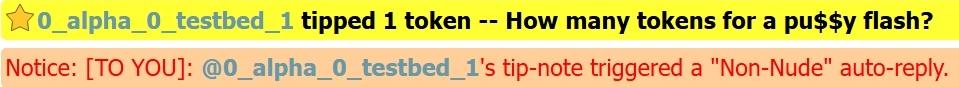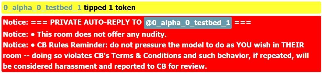 - The auto-moderator also privately auto-responds to tip-notes containing the same message-content that gets blocked from public-chat (the private-notice reminds the tipper that you have chosen to be a non-nude performer and gives them an anti-harassment warning that mirrors Chaturbate's chat rules/terms & conditions).