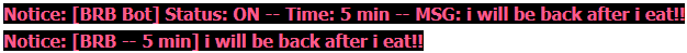 /brb msg -- ON/OFF & Sets new BRB message. Syntax: /brb BB Soon! :breaktime15