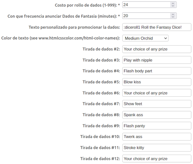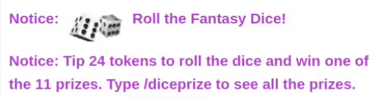 Dados de Fantasia se activa con una propina de cierta cantidad. El jugador gana uno de los 11 premios enumerados en el men煤 de premios (rollo 2-12). El bot Dados de Fantasia proporciona un anuncio cronometrado del juego y admite varios comandos para hacer cosas como ejecutar una venta, dar una tirada gratis, verificar las estad铆sticas del juego o cambiar la configuraci贸n sobre la marcha sin reiniciar el bot Dados de Fantasia.