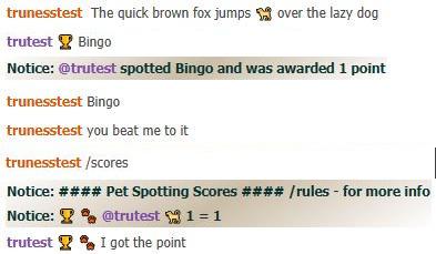 A game that keeps your room chat active as they watch for Three Pets🐕 / 🐈 / 🐁to appear between chat words to spot them. Three pets icons and names all customizable are used to identify the common, uncommon and rare pets. Then they appear in between chat words the first person to enter the pets name in chat will score points based on the pets chance of appearing. The game becomes addictive and before you know it you are staring at the chat waiting for one of the pets to appear.