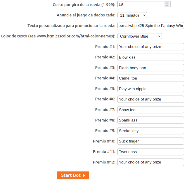La emisora puede establecer el costo de la propina por giro, la notificación de la rueda y el color del texto en la configuración de la página de inicio del bot.