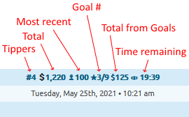 Free users may enable the statistical overlay panel. This overlay updates in real-time with token earning (total tippers, total earned, king, recent) and goal related (earnings, timers, etc) information. In the event this overlay is disabled, active goals will continue to display with a more verbose set of information.