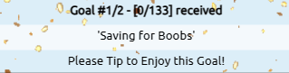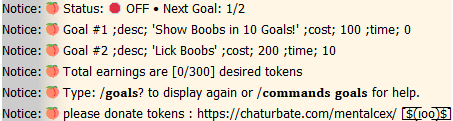 Active goals may be completed either by timer or by collected token amount! Goals completed by collected token amount automatically add their surplus tokens towards the next goal. This design feature was created to keep goals moving quickly! If you want a surplus to not start the tipping of the next goal, then you must use an intermission. Setting an intermission of 1 second will invisibly transition into your next goal starting with 0 tokens collected! Goals completed by timer mean that the time in which to purchase that goal has ended, and collected tokens are absorbed into your earnings, with the next goal starting with 0 tokens collected! Goals can be fully controlled through the /goals command. For help type /commands goals, and /goals? for active goal related information. Goals can be enabled by typing /goals, and then initialized by typing /goals on. Goals which are stopped (/goals off) will trigger a 10 second wait period. Goal related information will not clear until this 10 second wait period has expired. You can resume by typing /goals on.