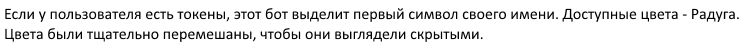 Si un usuario tiene tokens, este bot resaltará el primer carácter de su nombre. Los colores disponibles son Rainbow. Los colores se han mezclado cuidadosamente para que parezcan ocultos.