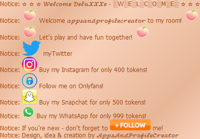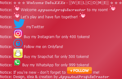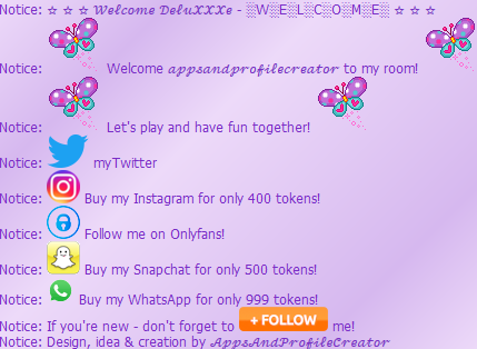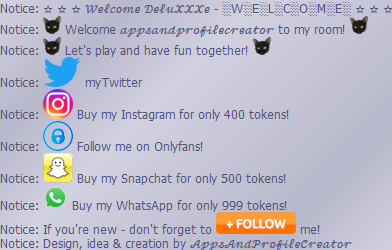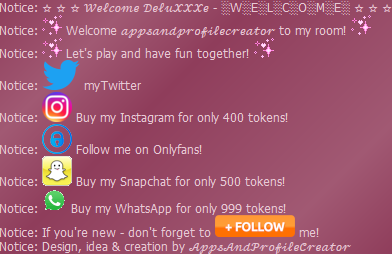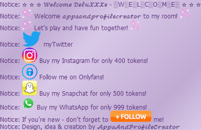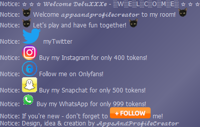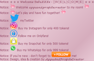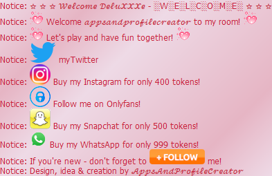 Overview ★ Shows a nice "Welcome" screen when the users enters the room ★ Features:      ✓ Two text lines which can be replaced by your own      ✓ Mention the user with the placeholder %user%      ✓ Add automatic a follow message with one click      ✓ Add automatic twitter, snap, insta, whatsapp and onlyfans with one click      ✓ Add automatic a gif decoration two both textlines with one click      ✓ See the welcome screen when the bots starts! ★ Choose if you want to write the twitter adress or do a advertising message:      ✓ Write instead of your twitter adress like :"myTwitter"      ✓ Buy my twitter for 400 tokens! ★ Additional informations:      ✓ Comming soon!